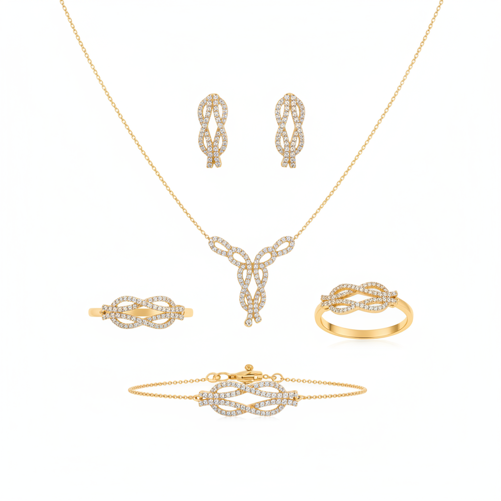 تصميم متداخل يمنح الطقم لمسة فريدة مثلك، يأتي الطقم من الذهب عيار 18، مكون من: عقد، أقراط، خاتم، أسورة
