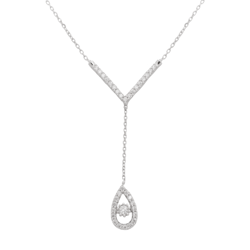 عقد فاخر مصاغ من الذهب الأبيض عيار 18، يتميز بتصميم عصري يجمع بين الرقة والفخامة، حيث تتدلى منه قطرة مرصعة بالفصوص البيضاء التي تضفي بريقاً ساحراً على إطلالتك في كل المناسبات.