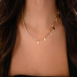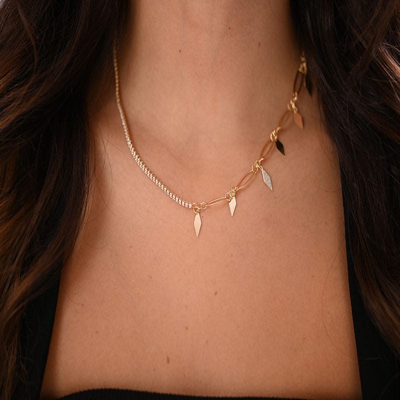 عقد ذهب عيار 18 بتصميم معاصر يتميز بتعليقات هندسية متدلية أنيقة. تتناسب بسهولة مع مختلف السلاسل والإكسسوارات، مما يمنحك مرونة في التنسيق اليومي.