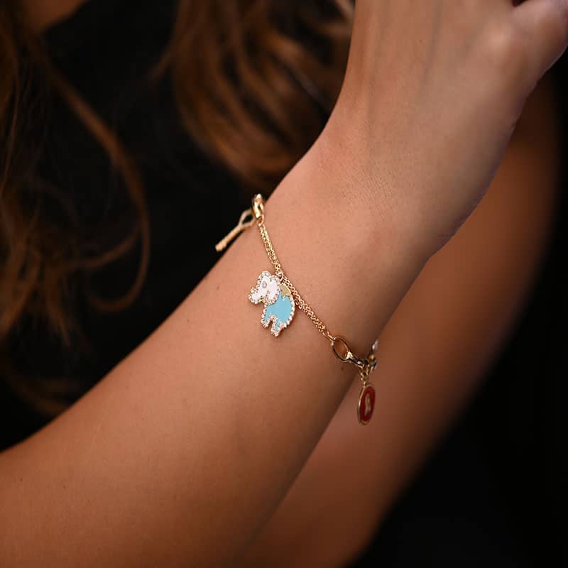 أنسيال ذهب عيار 18، بتصميم يحمل تعليقات متنوعة متدلية علي شكل فيل في المنتصف.