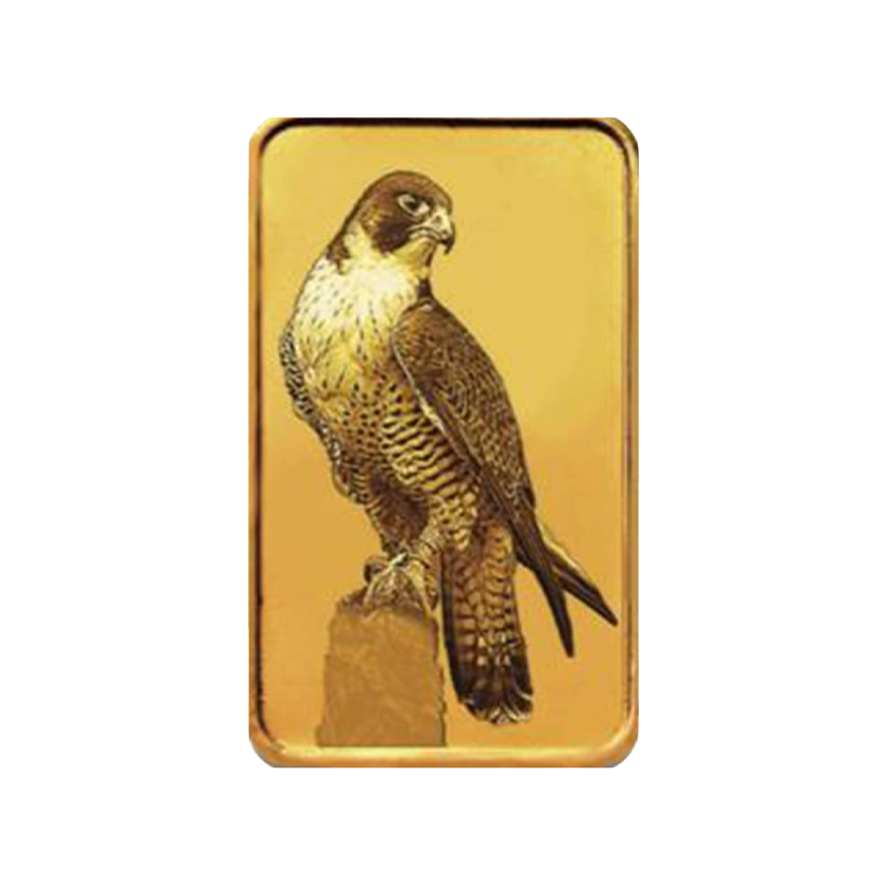 سبيكة مصنوعة من الذهب عيار 24 بوزن 2.5 جم، تأتي بتصميم صقر بتفاصيل دقيقة داخل إطار مستطيل أنيق. يعكس التصميم حضوراً قوياً ويمنح القطعة طابعاً مميزاً، ما يجعلها مناسبة للاقتناء أو الإهداء مع الحفاظ على القيمة الذهبية وجودة التصنيع.