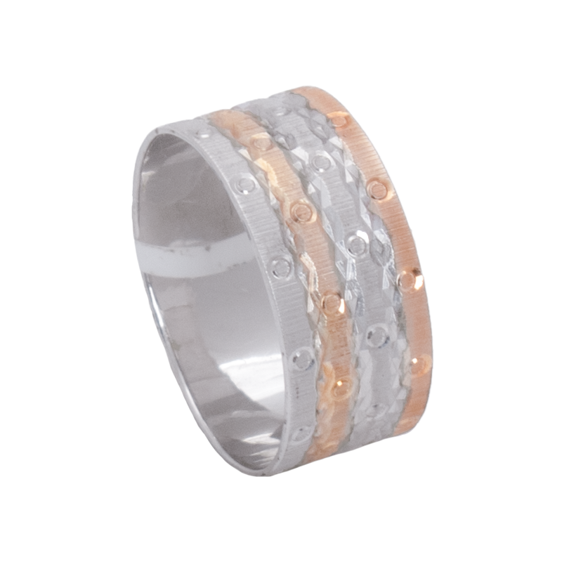 دبلة ذهب عيار 18 بتصميم عريض تتكون من سطح مزخرف بخطوط محفورة متوازية تضيف لمسة ناعمة ومتناسقة، ليمنح الإطلالة أسلوباً بسيطاً وراقياً يمكن تنسيقه بسهولة مع مختلف المجوهرات الأخرى في الإطلالات اليومية والمناسبات.