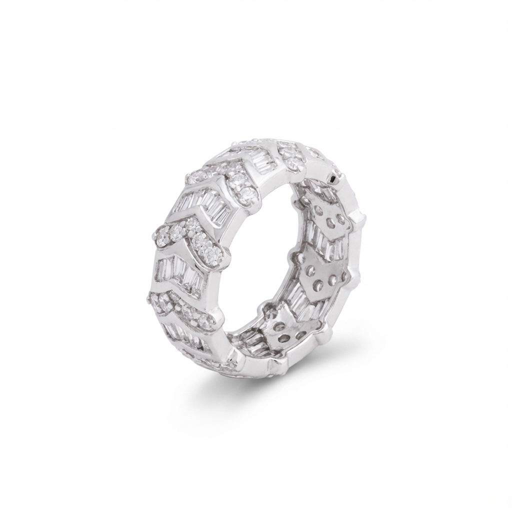 خاتم ذهب عيار 18 بتصميم هندسي مزين بفصوص يمنح إطلالتك مظهراً فاخراً ولافتاً. قطعة مميزة تناسب المناسبات وتضفي بريقًا راقيًا على اليد.