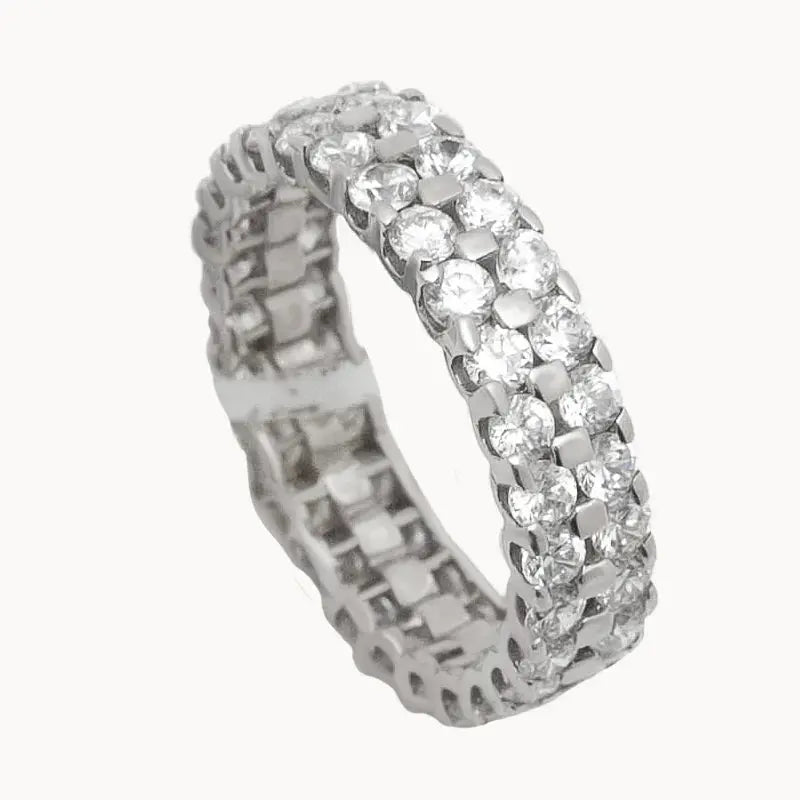 دبلة كينزي ذهب عيار 18 بتصميم فاخر مرصع بفصوص لامعة موزعة بدقة حول الدبلة بالكامل. قطعة تجمع بين الفخامة واللمعان المميز لتضفي لمسة راقية على يدك في كل مناسبة.