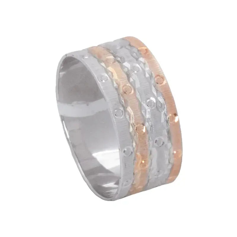 دبلة ذهب عيار 18 بتصميم عريض تتكون من سطح مزخرف بخطوط محفورة متوازية تضيف لمسة ناعمة ومتناسقة، ليمنح الإطلالة أسلوباً بسيطاً وراقياً يمكن تنسيقه بسهولة مع مختلف المجوهرات الأخرى في الإطلالات اليومية والمناسبات.